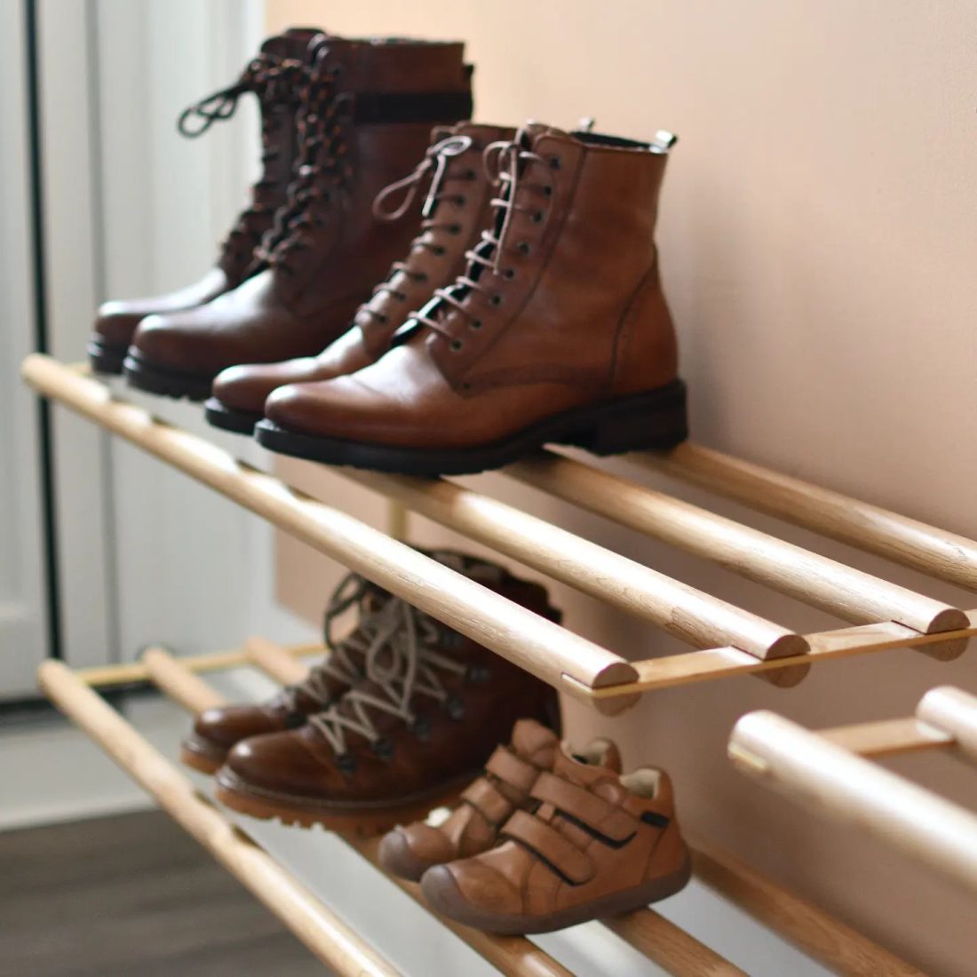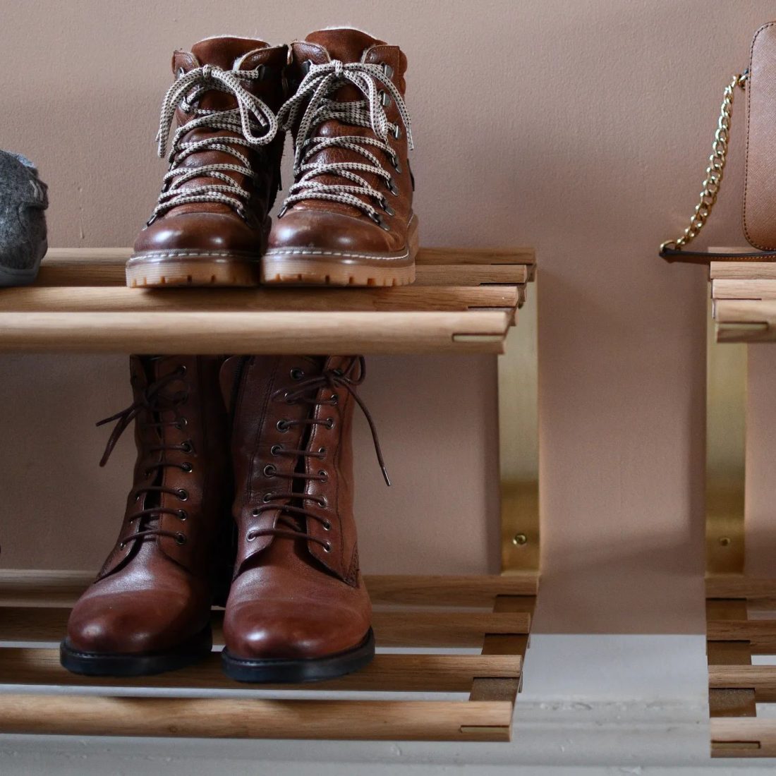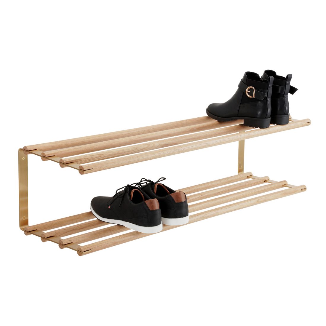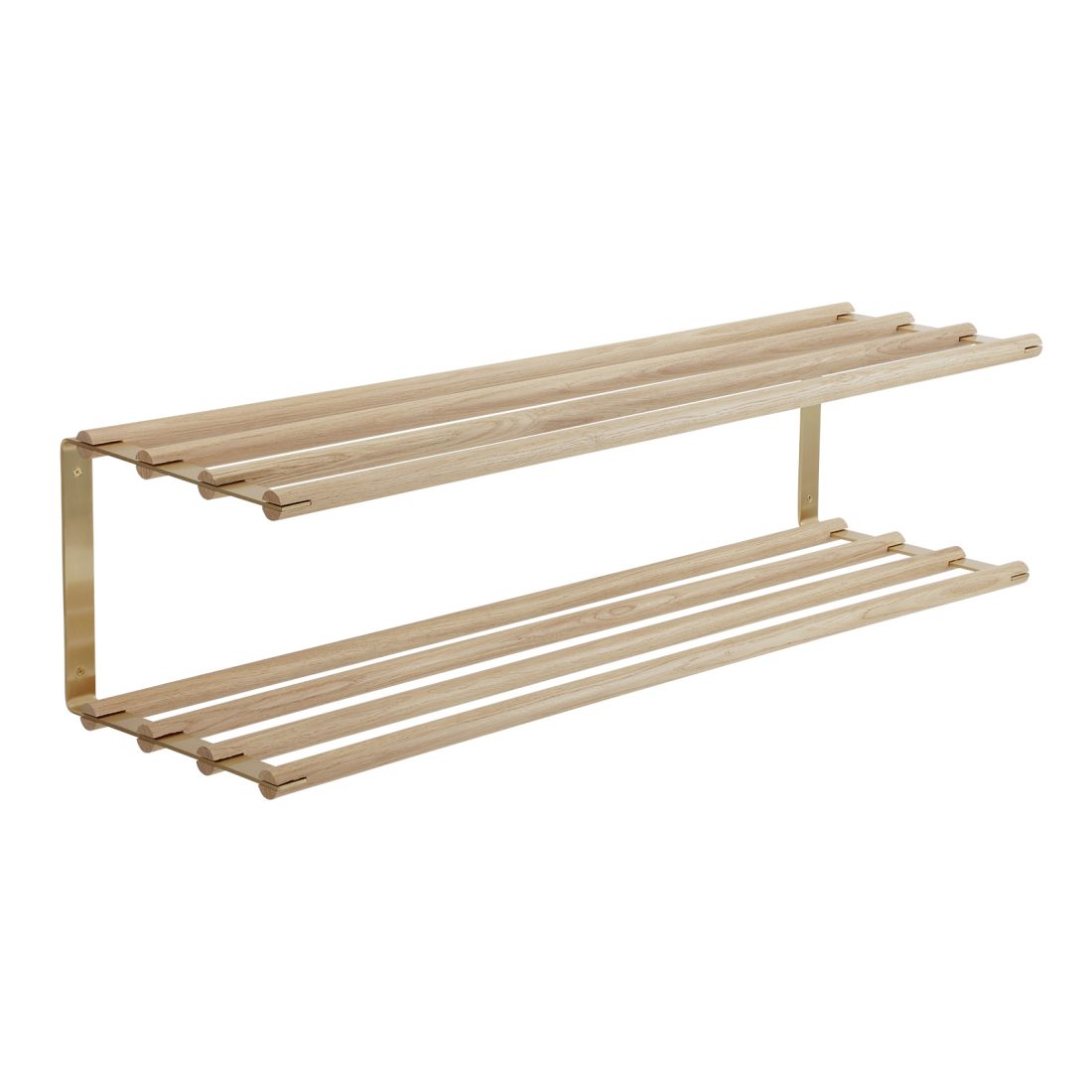 Vår minimalistiska och eleganta skohylla är tillverkad av ekträ och lackad mässing. Skohyllan hängs upp på väggen och har två rader för skor. Genom att placera skohyllan högt på väggen skapas utrymme för skor under den.